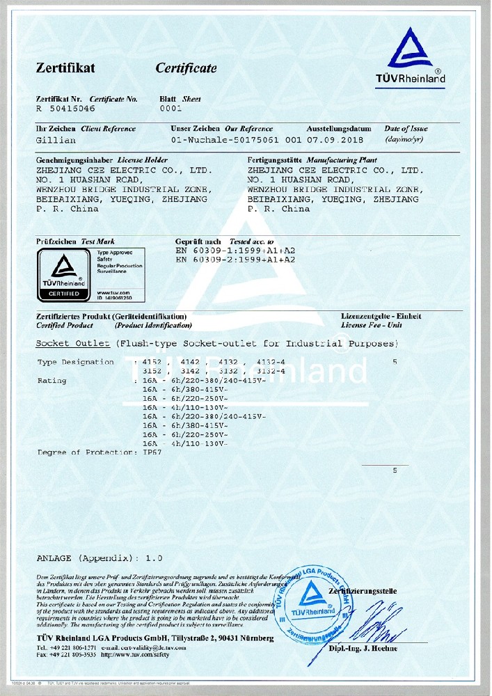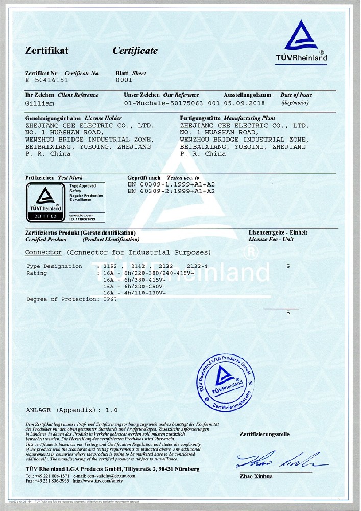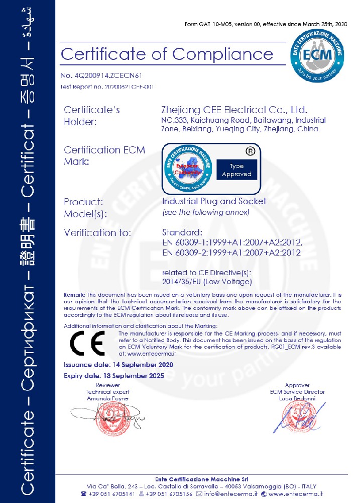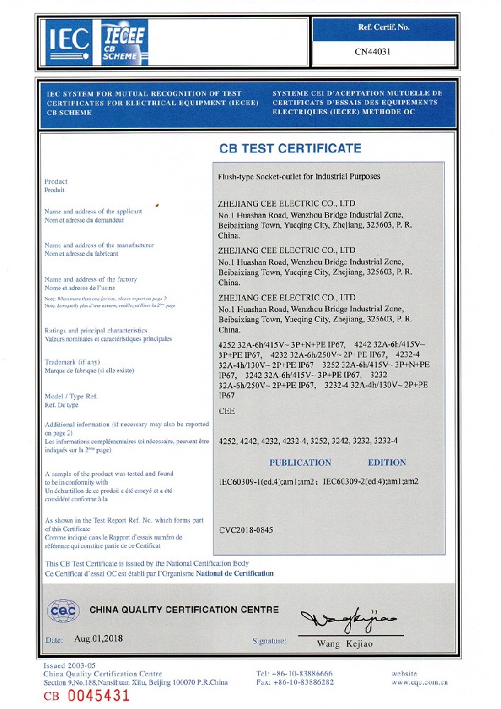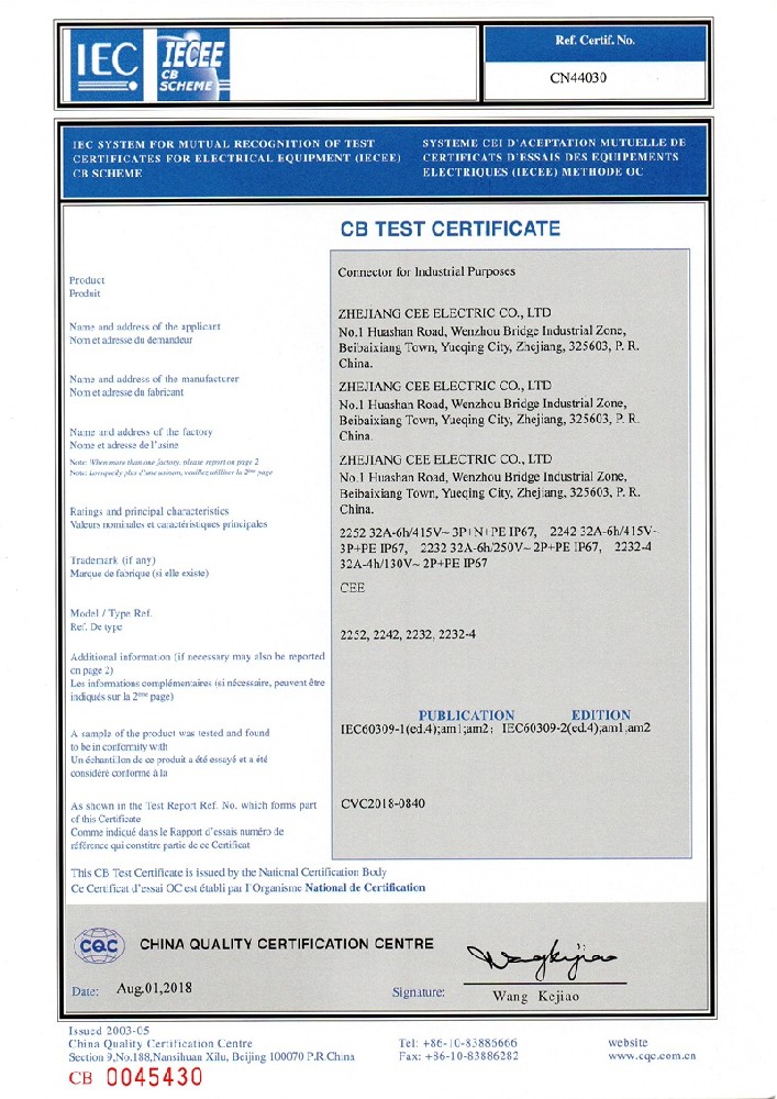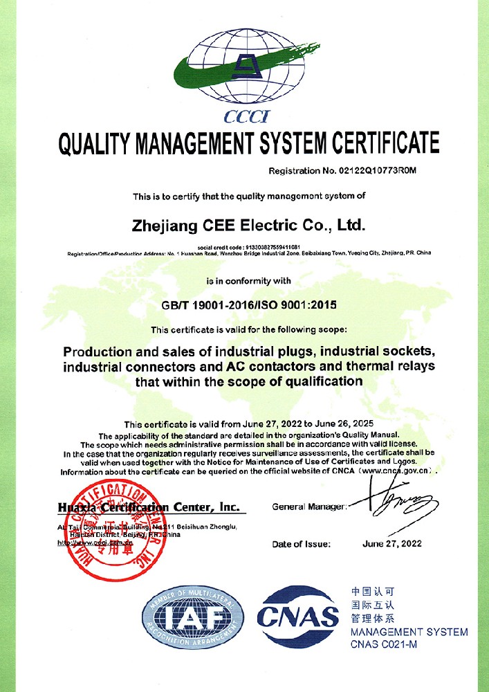 公司全面貫徹實(shí)施IS09001:2015質(zhì)量管理體系認(rèn)證。工業(yè)插頭插座符合IEC 603 09-1-2, EN 60 309-1-2國際標(biāo)準(zhǔn), 組合插座箱符合EN61439標(biāo)準(zhǔn),并通過Intertek & TUV Rheinland & CQC等認(rèn)證。證書包括TUV、SEMKO、CE、CB、EAC,并符合RoHS和Reach等適用法規(guī)。公司引進(jìn)先進(jìn)生產(chǎn)設(shè)備和精密檢測試驗(yàn)儀器、不斷引入高科技工藝流程和技術(shù)人才,為公司的產(chǎn)品研發(fā)、質(zhì)量升級(jí)、管理創(chuàng)新提供了強(qiáng)有力的保障。公司將持續(xù)以優(yōu)質(zhì)的產(chǎn)品和服務(wù),贏得客戶的最大滿意為宗旨,發(fā)揚(yáng)“創(chuàng)新、服務(wù)、溝通”的企業(yè)精神,力促CEE品牌從中國走向世界。我們牢牢把握時(shí)代賦予的使命和機(jī)遇,與海內(nèi)外合作伙伴共同開創(chuàng)事業(yè)的新高度。
