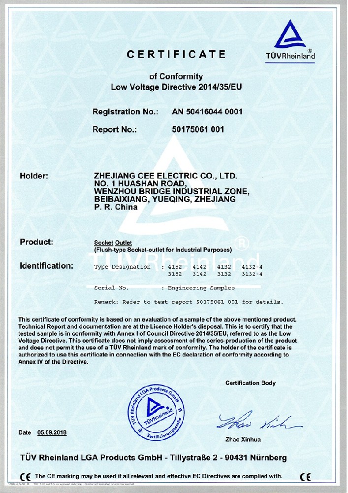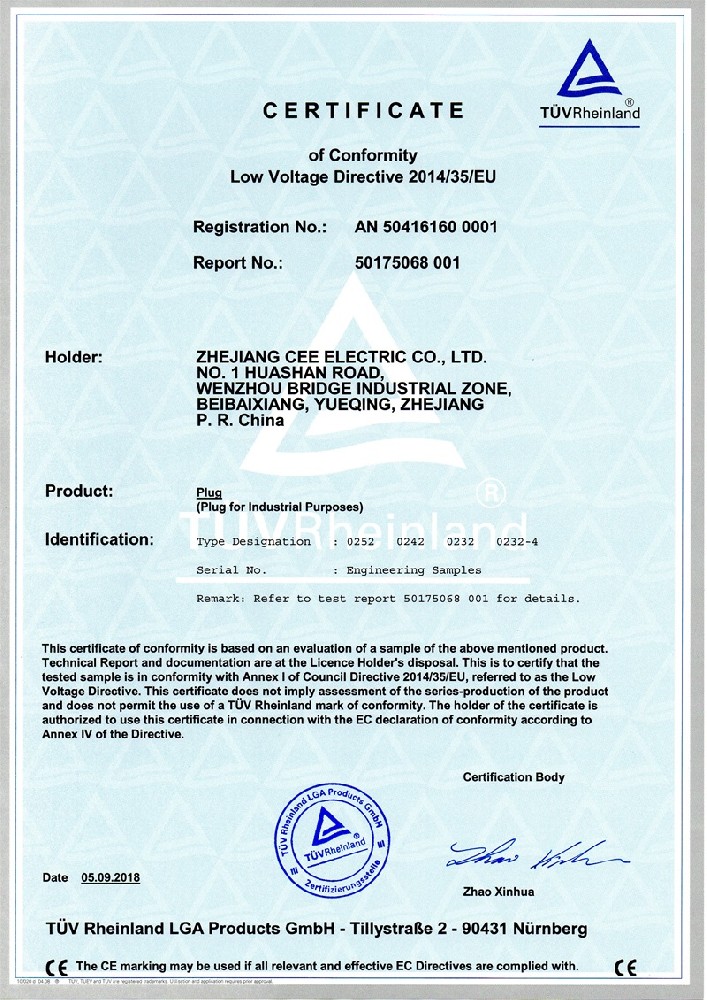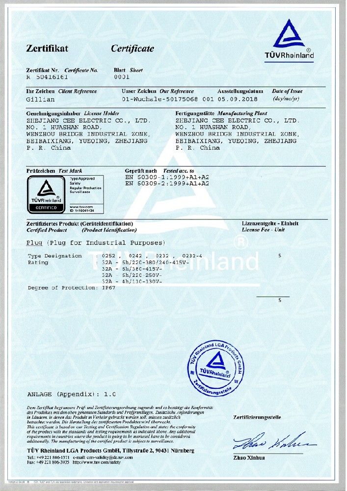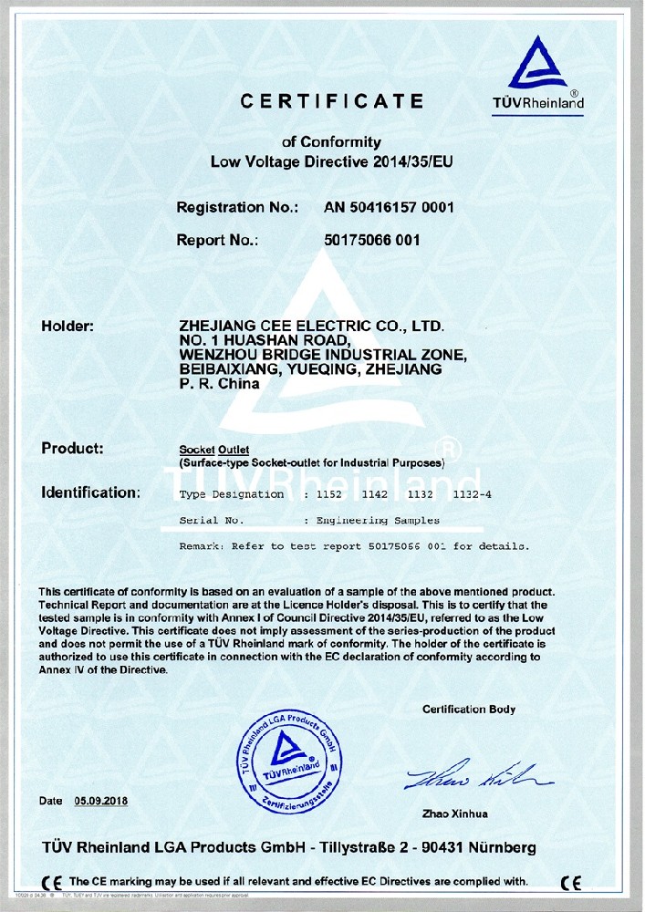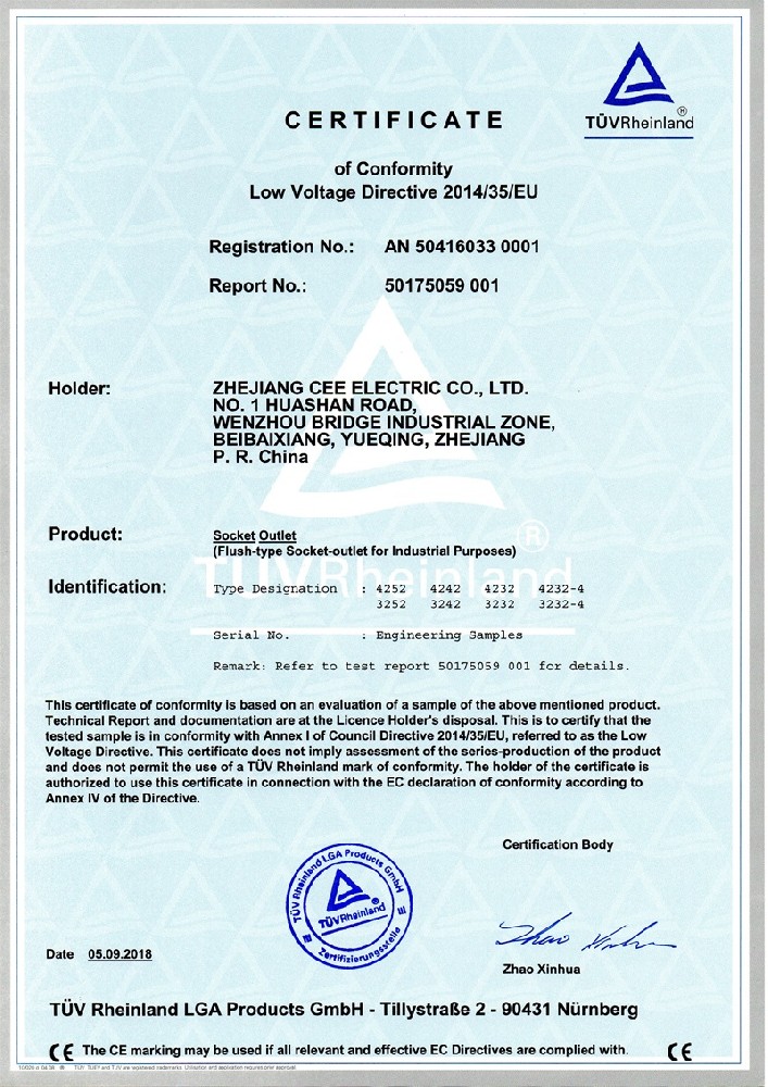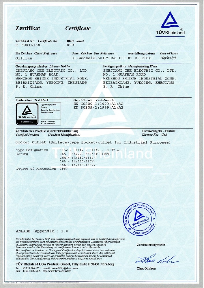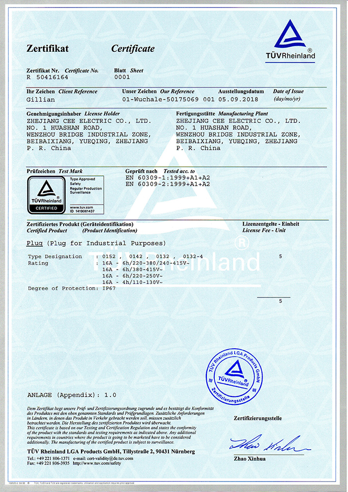 公司全面貫徹實(shí)施IS09001:2015質(zhì)量管理體系認(rèn)證。工業(yè)插頭插座符合IEC 603 09-1-2, EN 60 309-1-2國際標(biāo)準(zhǔn), 組合插座箱符合EN61439標(biāo)準(zhǔn),并通過Intertek & TUV Rheinland & CQC等認(rèn)證。證書包括TUV、SEMKO、CE、CB、EAC,并符合RoHS和Reach等適用法規(guī)。公司引進(jìn)先進(jìn)生產(chǎn)設(shè)備和精密檢測試驗(yàn)儀器、不斷引入高科技工藝流程和技術(shù)人才,為公司的產(chǎn)品研發(fā)、質(zhì)量升級(jí)、管理創(chuàng)新提供了強(qiáng)有力的保障。公司將持續(xù)以優(yōu)質(zhì)的產(chǎn)品和服務(wù),贏得客戶的最大滿意為宗旨,發(fā)揚(yáng)“創(chuàng)新、服務(wù)、溝通”的企業(yè)精神,力促CEE品牌從中國走向世界。我們牢牢把握時(shí)代賦予的使命和機(jī)遇,與海內(nèi)外合作伙伴共同開創(chuàng)事業(yè)的新高度。