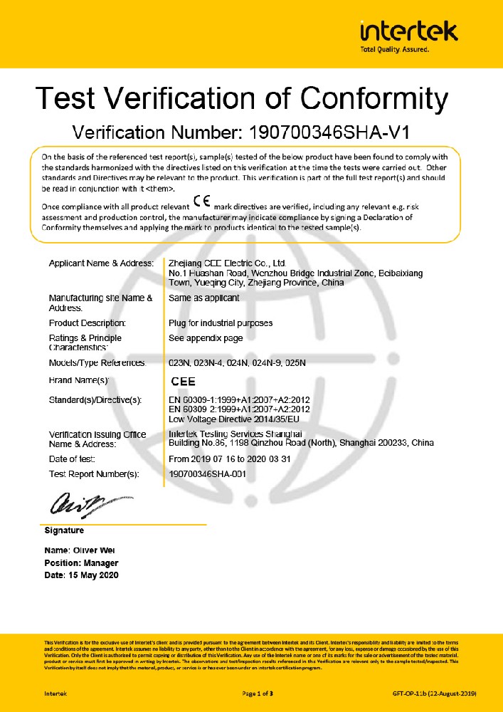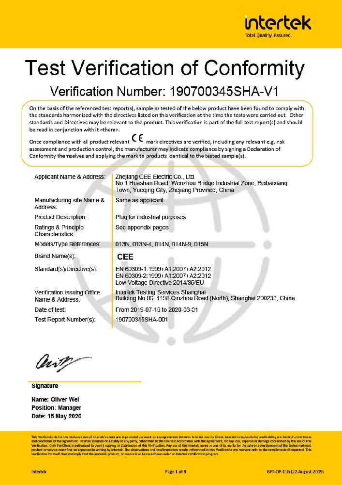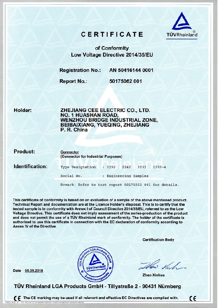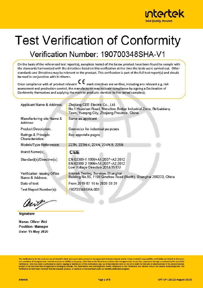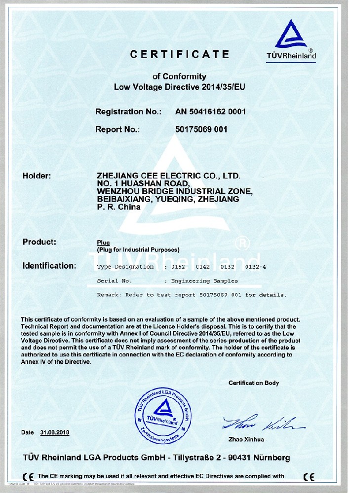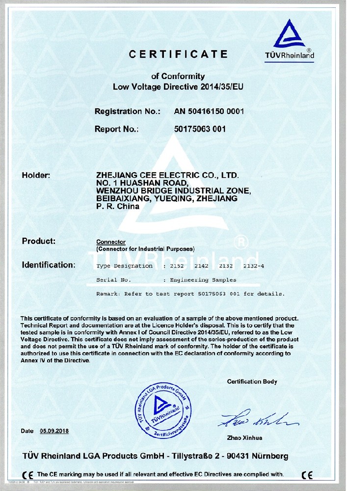 公司全面貫徹實(shí)施IS09001:2015質(zhì)量管理體系認(rèn)證。工業(yè)插頭插座符合IEC 603 09-1-2, EN 60 309-1-2國際標(biāo)準(zhǔn), 組合插座箱符合EN61439標(biāo)準(zhǔn),并通過Intertek & TUV Rheinland & CQC等認(rèn)證。證書包括TUV、SEMKO、CE、CB、EAC,并符合RoHS和Reach等適用法規(guī)。公司引進(jìn)先進(jìn)生產(chǎn)設(shè)備和精密檢測試驗(yàn)儀器、不斷引入高科技工藝流程和技術(shù)人才,為公司的產(chǎn)品研發(fā)、質(zhì)量升級(jí)、管理創(chuàng)新提供了強(qiáng)有力的保障。公司將持續(xù)以優(yōu)質(zhì)的產(chǎn)品和服務(wù),贏得客戶的最大滿意為宗旨,發(fā)揚(yáng)“創(chuàng)新、服務(wù)、溝通”的企業(yè)精神,力促CEE品牌從中國走向世界。我們牢牢把握時(shí)代賦予的使命和機(jī)遇,與海內(nèi)外合作伙伴共同開創(chuàng)事業(yè)的新高度。